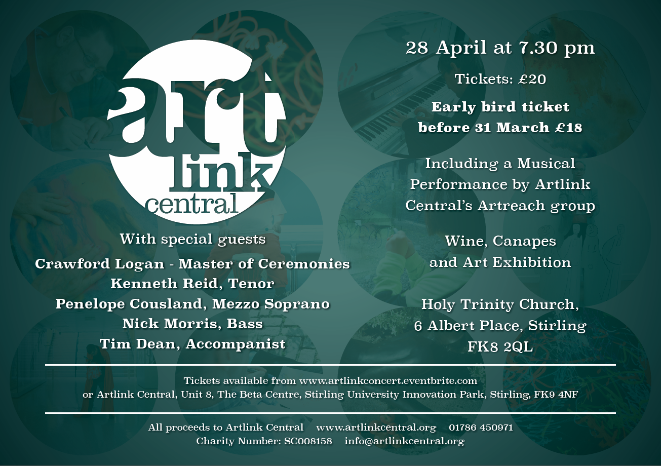 Artlink Central has great pleasure in inviting you to celebrate their 30th anniversary with a concert of songs, music and memories at the Holy Trinity Church, Stirling on 28 April at 7.30 pm. Please join us for this special fundraising event hosted by Crawford Logan as Master of Ceremonies with all proceeds going to Artlink Central.