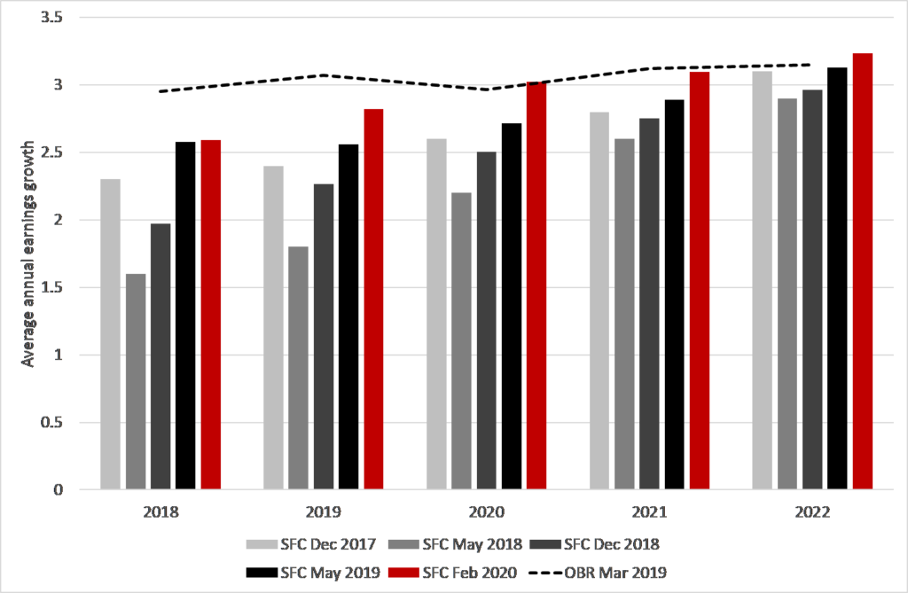 - But offsetting this, earnings growth has been stronger than forecast during 2018 and 2019. This causes the SFC to revise up its forecasts for 2018/19 and subsequent years.