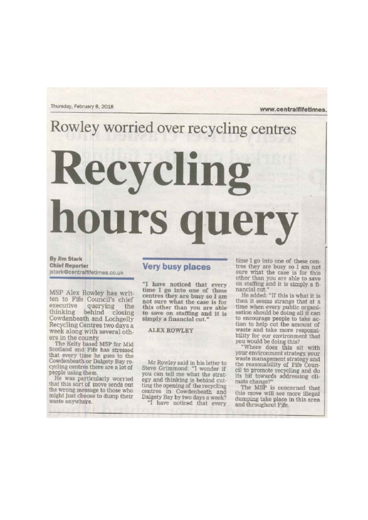 08 FEB Central Fife Times 08.02.18 - Recycling Centres Post Author: Alex Rowley http://www.alexrowley.org/about/