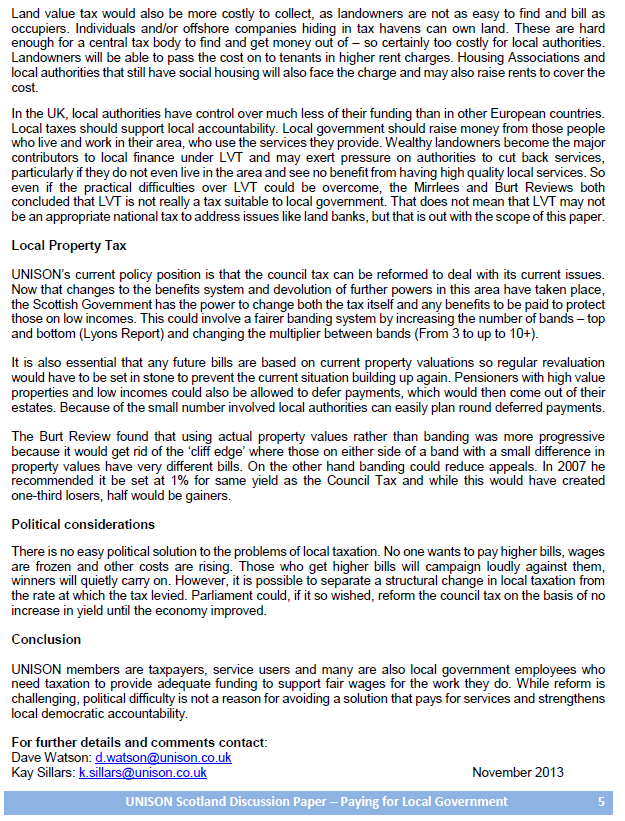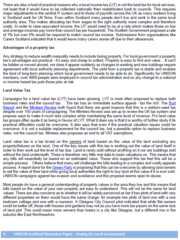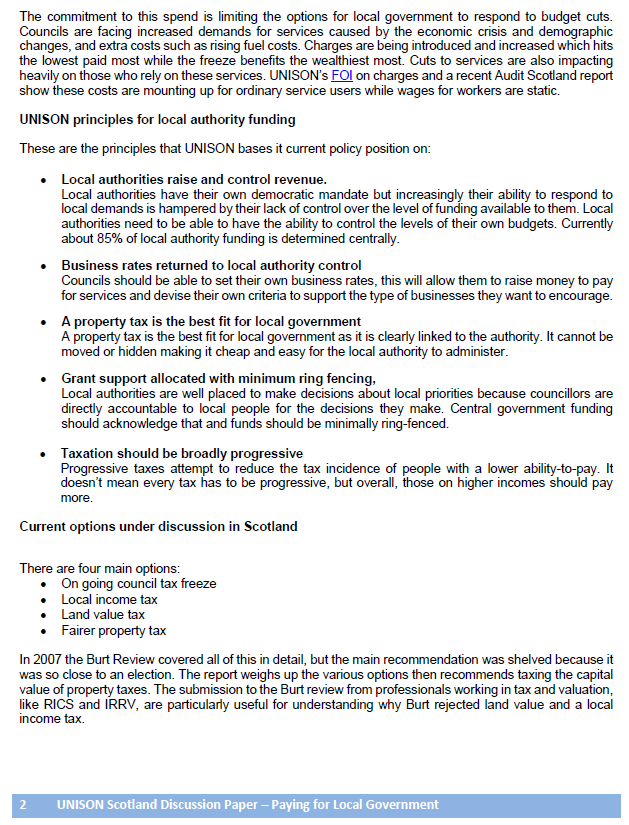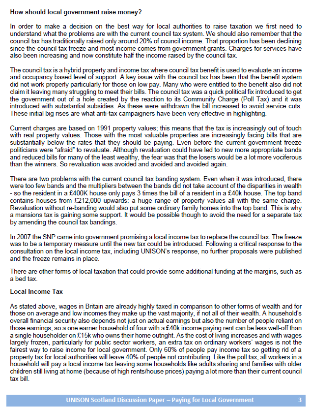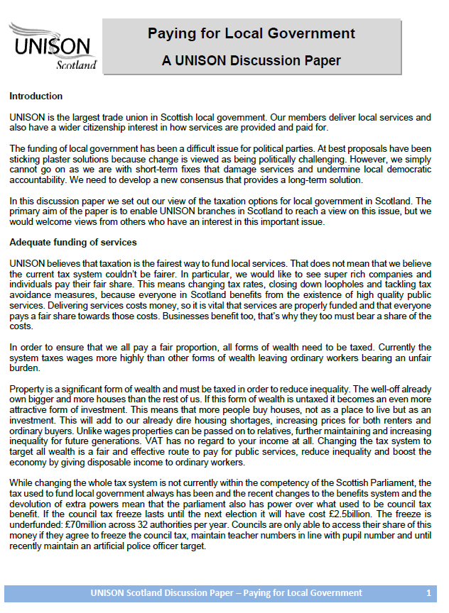 The Scottish Government is in the process of setting up an all-party commission to examine the options for funding what is currently the council tax element of local government finance; around 18% of council’s budget. Below is a paper written by Unison Scotland which outlines their views on how local government should be funded and is a good document to begin a conversation that I believe needs to take place across Scotland.