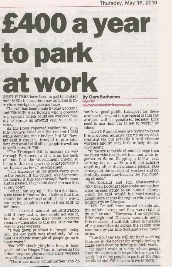 16 MAY Dunfermline Press 16.05.19 - Workplace Parking Tax Post Author: Alex Rowley http://www.alexrowley.org/about/