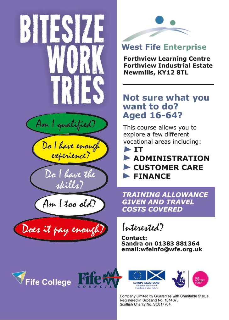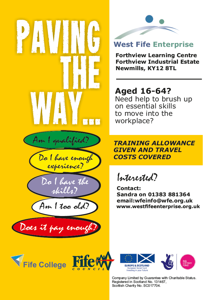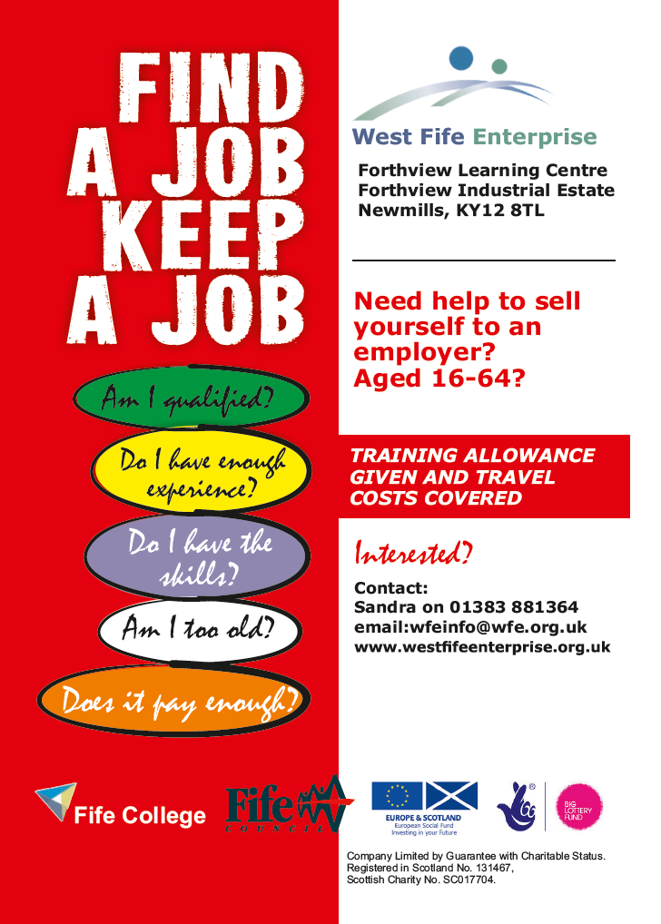 West Fife Enterprise have produced 4 new information leaflets which can ofer support and advice to those looking for employment. If you know anyone who is looking for employment or if you are searching for a job yourself West Fife Enterprise can offer you assistance and you can get in touch by calling: 01383 881364.